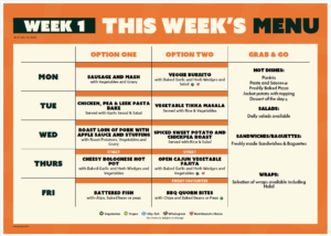 Daily choices include two main dishes, (one of which is a vegetarian option), along with lighter bites such as baked potatoes, sandwiches, pasta, wraps, and paninis.
