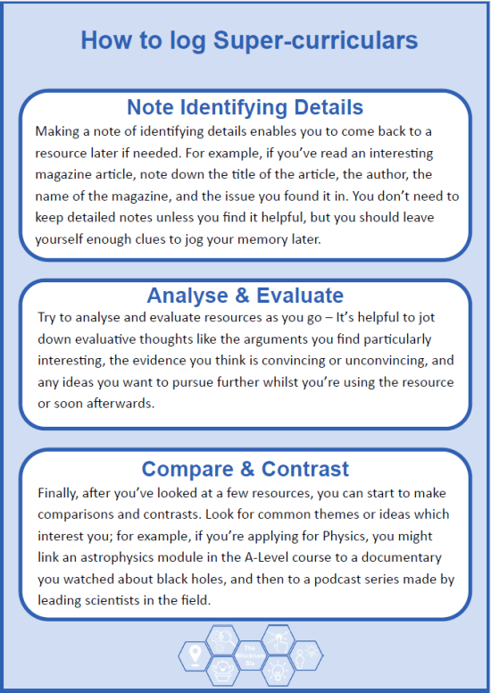 Super-curricular activities are those that take the subjects you study further, beyond that which your teacher has taught you or what you’ve done for homework. (Oxford University)